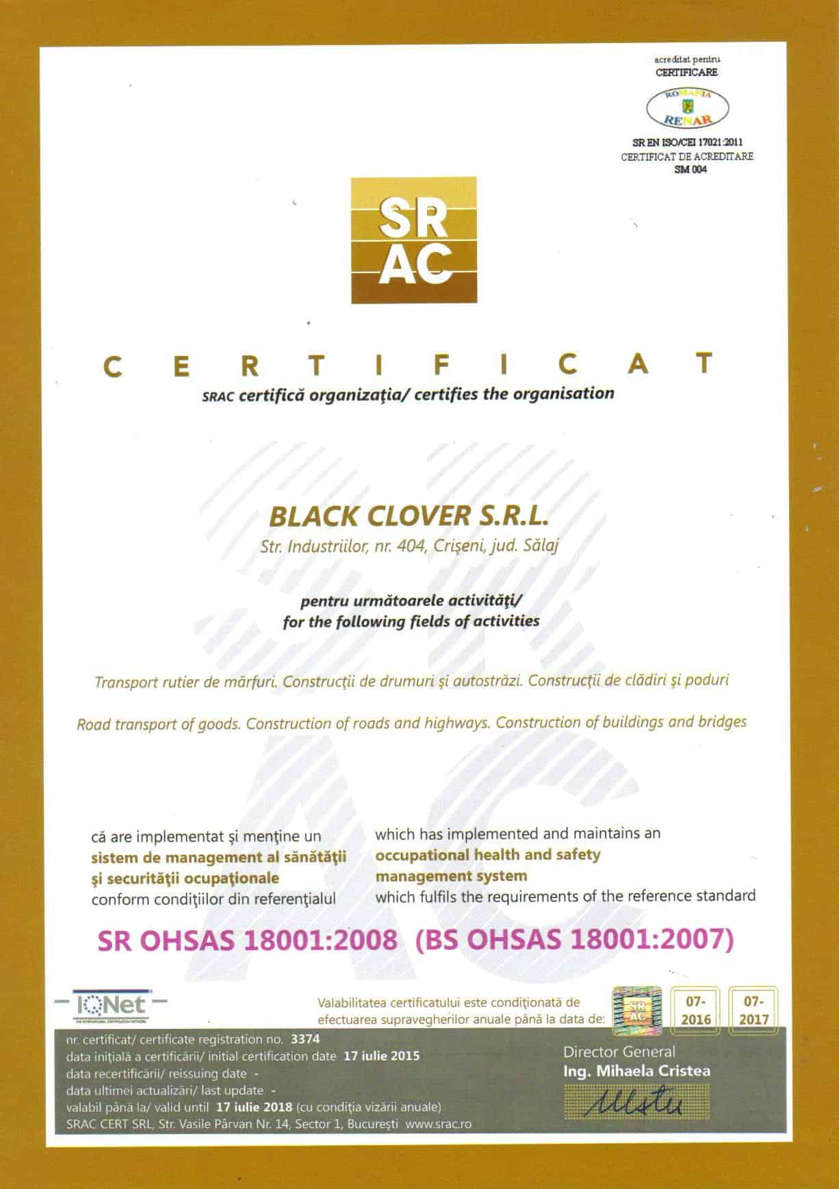 OHSAS 18001:2007 reprezinta un model de lucru pentru organizatiile care doresc un control mai bun asupra riscurilor profesionale. Acesta a fost gandit pentru a completa sistemele de management al calitatii si respectiv de mediu si se bazeaza pe cerinte explicite pentru o gestionare cat mai eficienta a riscurilor profesionale si crearea unui culturi de prevenire in randul angajatilor.